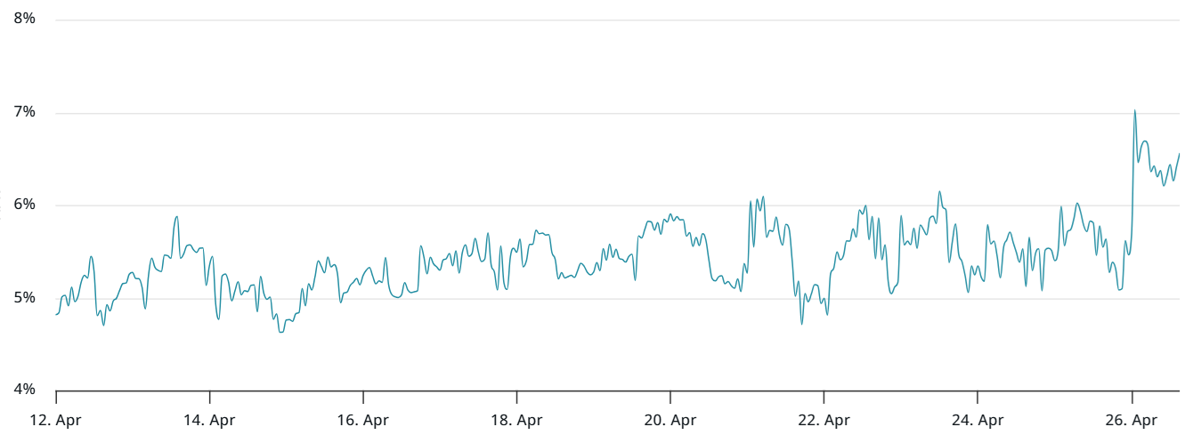 在 4 月 26 日,兩個月比特幣期貨溢價(基差)升至 7 周以來最高,代表對於做多部位的興趣提高。這個指標現在處於 6.5%,依然在 5% 至 10% 的中性範圍內,而且正在遠離看跌區域。