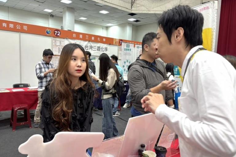 ▲校方今年設置「外籍人士媒合專區」,就讀餐旅學系大四生阮氏姮參加面談。(圖/記者蔣彤雲攝)