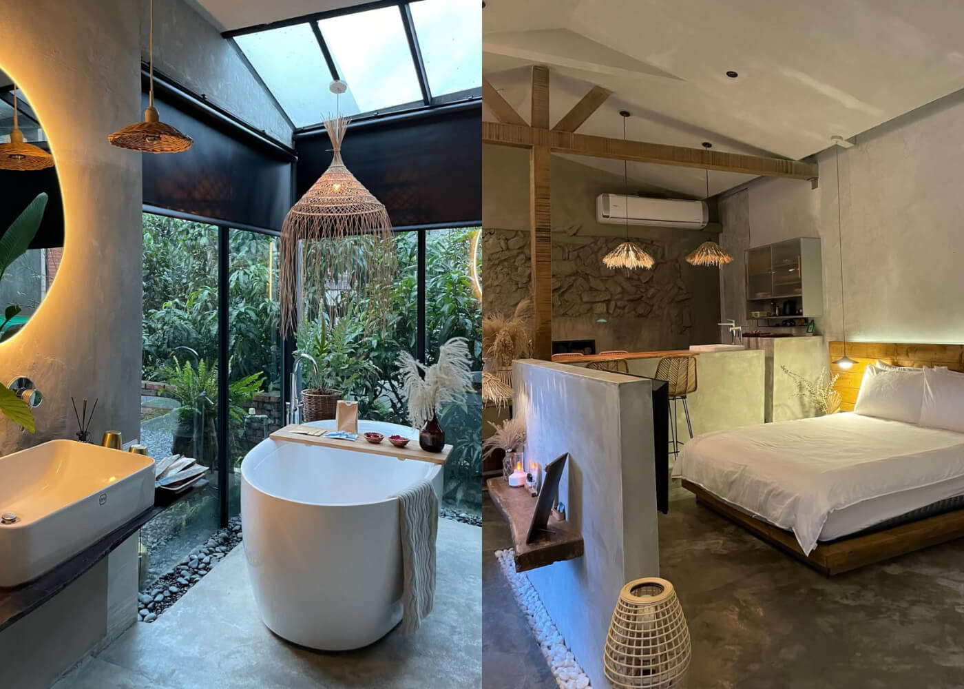 神隱之森是九份很有名的森林系秘境民宿,鄰近九份老街,分為本館和木質調館,木造屋頂建築結構,現代典雅的室內空間非常舒服,浴室的落地窗,邊泡澡還能欣賞外頭景色,超絕鬆弛感讓壓力得到釋放,其中木質調館是絕美的玻璃屋設計,夜晚時在室內就可以欣賞點點星空。包棟人數本館2-7人、木質調館2-6人,費用5,800元起,每多一人加收1,200元,採自助入住,旅宿主人會在您入住前,發送自行入住辦法至您訂房時提供的電子信箱。如同世外秘境般的神隱之森,無論是家庭聚會還是情侶度假,都能在這裡找到靜逸的私密空間。