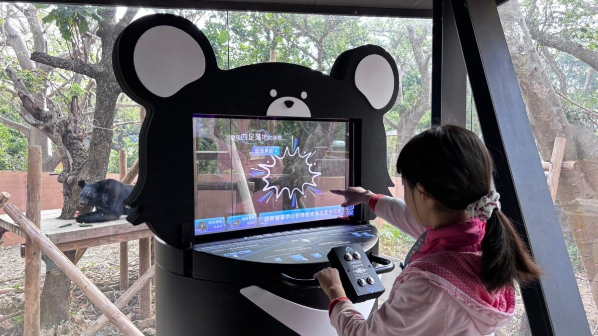 ▲小朋友體驗「AI智慧環境導覽系統」園方表示,遊客可透過旋轉升降的透明螢幕,觀察「波比」及其生活區域。當遊客將螢幕指向黑熊或其環境時,系統會自動以AR模式展示「波比」的知識介紹和生活花絮,讓每位遊客都能近距離觀察「波比」的行為。此外,該系統利用動物肢體數據開發的AI模型,能辨識「波比」的日常姿態,並依此提供趣味互動問答,讓遊客可直接向「波比」提問,例如最愛的食物、年齡,甚至牠出生時胸前是否有標誌性的V字型毛色等,增添與「波比」互動樂趣。