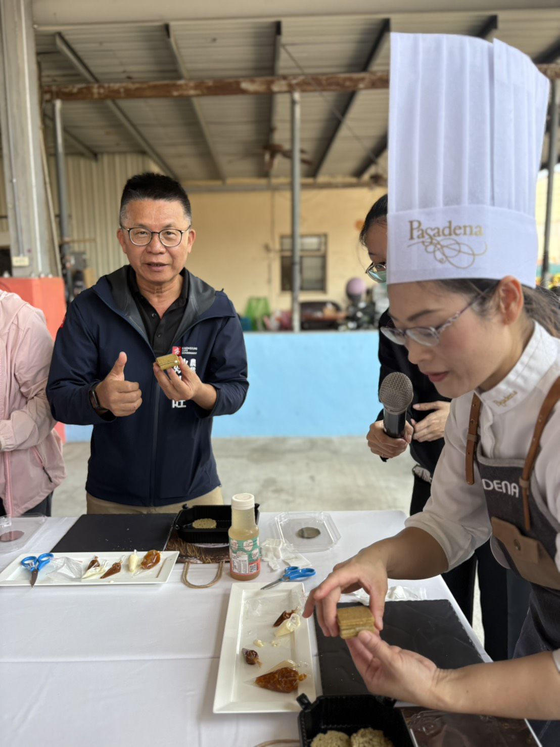 ▲杉林社區發展協會理事長陳國忠致詞杉林社區發展協會理事長陳國忠表示,本次發表的兩款產品皆選用杉林在地優質鳳梨與芒果,在農業局積極輔導和樹德科技大學NPO研發中心媒合下,由帕莎蒂娜主廚團隊運用創意巧思與專業技術,轉化為具地方特色又具市場潛力的精緻甜點。「鳳梨酥盒」以香氣濃郁的鳳梨果乾、搭配茶香酥鬆外皮,層次豐富口感迷人;「金萱芒果沙布烈」則將杉林芒果的鮮甜與茶香結合,打造出清爽不膩的夏季風味甜點。這兩款新品不僅是產品創新,更象徵農村產業鏈的再升級。