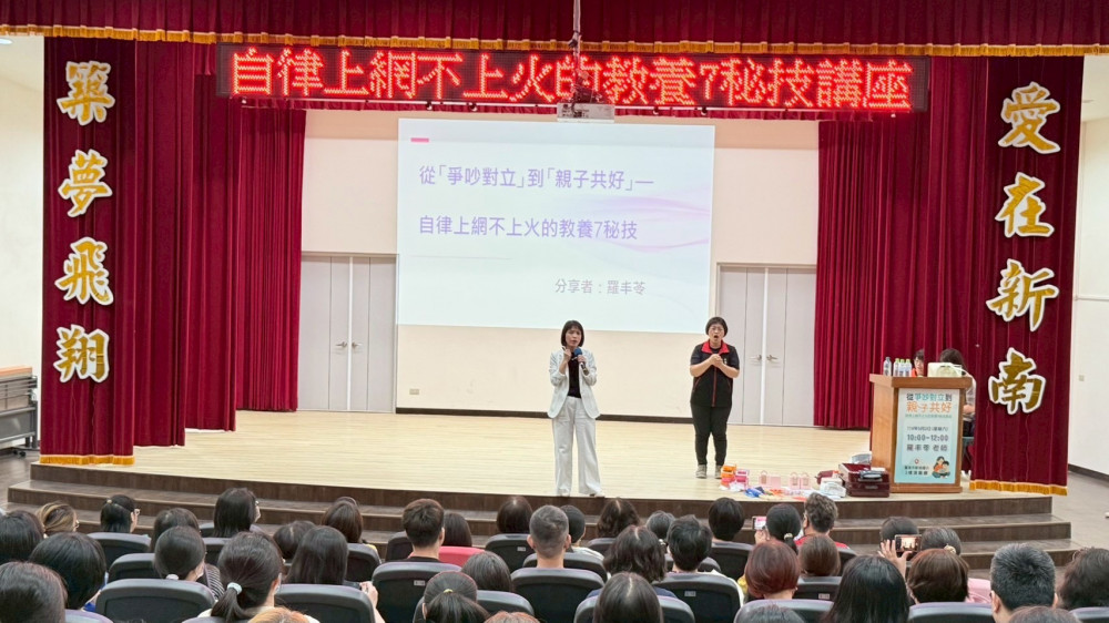 5月3日(星期六)在安平區新南國小辦理「從『爭吵對立』到『親子共好』─自律上網不上火的教養7秘技」講座,由輔導老師羅丰苓主講,引導家長正確數位教養觀念,需先停止錯誤管教手機方式,並瞭解孩子沉迷背後的原因,才能透過有效能的管教方式改變孩子的行為,並鼓勵父母雙方同心協力,一起陪伴孩子走在自律共好的網路時代。