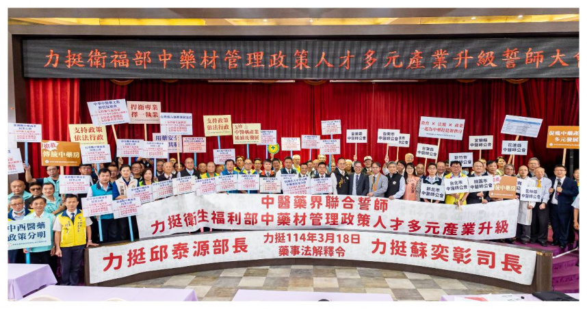 中醫藥界聯合誓師大會,5/2日假台北國軍英雄館舉行,由財團法人中華民國中藥發展基金會、台灣中藥經貿文化協會、台灣中藥學會、台灣中藥權益促進會、台中市中醫藥學會、蘭陽養生藥膳研究協會、台灣漢方創藝發展協會、中華中醫藥文教經貿促進會、台中市中藥產業促進會等聯合誓師群起呼應;邱泰源部長與中醫藥司蘇奕彰司長展現出堅實的遠見與行動力。