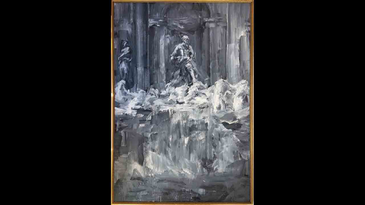 ↑圖說:嚴培明(Yan Pei-Ming),特雷維噴泉│2015│330cmx215cmx12cm│油畫。嚴培明1960年出生於上海,以其富有力量與情感張力的表現主義肖像畫風格廣受讚譽。他的繪畫題材廣泛,涵蓋公眾人物、時事事件、靜物風景、宗教、親友及動物等多元主體。透過厚重筆觸與強烈光影捕捉瞬間情感與存在狀態。嚴培明的作品多以黑白或紅白等高對比的單色調進行創作,從而突顯作品的主題與構圖。他以巨大的力量與豐富的想像力作畫,因此在他的作品裡可見獨特而富有表達力的筆觸,並同時極具神秘感。在近觀時呈現近乎抽象的繪畫肌理,遠觀則凝聚為強烈具象的形象,這種從古典油畫傳統出發、轉化為當代語境的視覺表現,使其作品既具歷史厚度,又充滿當代精神。(圖片來源:寶吉祥藝術中心提供)