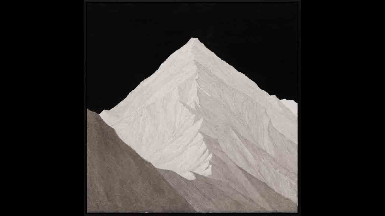 ↑圖說:高定 Gao Ding,北稜角│2025│70cm × 70cm│紙本水墨。高定現為國立臺灣藝術大學書畫藝術學系碩士生,專注以黑白水墨描繪台灣高山風景。自2020年起他便運用水墨、楮皮紙與高知麻紙,捕捉山體岩塊的銳利質感與箭竹草原的起伏。他以近乎執拗的乾筆皴法層層堆疊,筆痕如同行走山脊的足跡,緩慢而堅定,呈現與山對話般的修行歷程,映射出風景與內在情感的共構。(圖片來源:寶吉祥藝術中心提供)