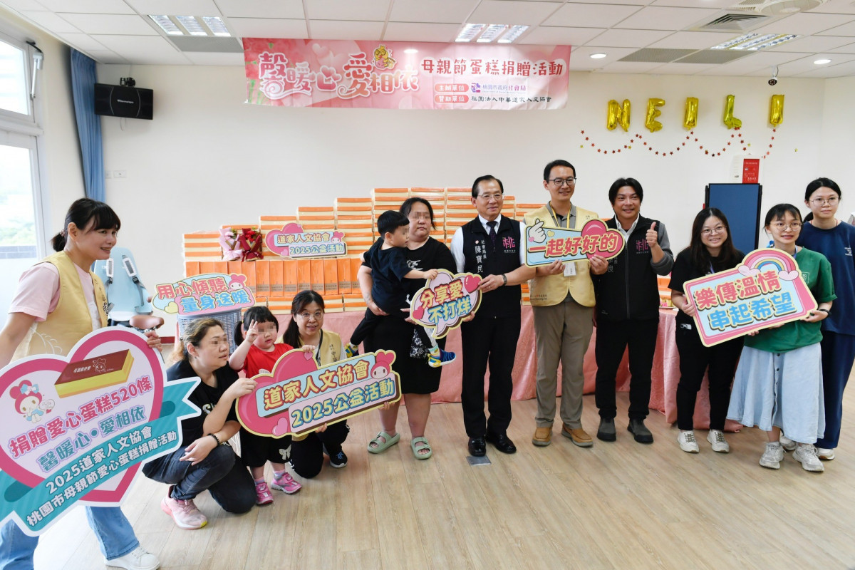 充滿愛的母親節蛋糕,撫慰了辛勞的弱勢家庭母親及照顧者,更凝聚起全家人的心,因「愛」緊緊相依。道家人文協會於6日,舉辦馨暖心‧愛相依~桃園市母親節愛心蛋糕捐贈活動,將數量象徵「我愛你」的520條愛心蛋糕,捐贈給轄區內弱勢家庭,由桃園市政府社會局局長陳寶民代表受贈,六年累計數量達3150條。現場也邀請兩戶家戶代表到場,由協會秘書長王愍之致贈蛋糕及其中一戶所需的腳踏車,為家戶媽媽溫馨圓夢。