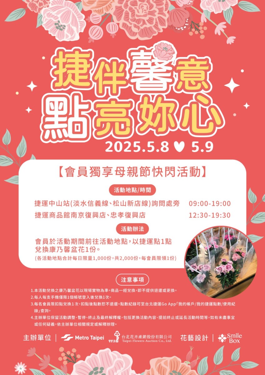 5月8日、9日連續兩天,上午9時至晚間7時至捷運中山站(松山新店線、淡水信義線)詢問處旁,或中午12時30分至晚間7時30分至臺北捷運商品館(南京復興店、忠孝復興店),憑「台北捷運Go」App會員捷運點1點,可兌換康乃馨盆花1組,每位會員限領1份,數量有限、兌完為止。