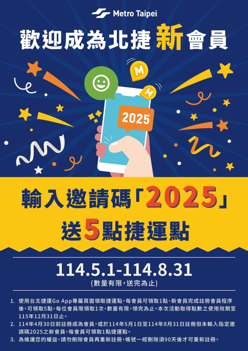 ▲免費送康乃馨辦法地點詳見活動海報。捷運點大放送!即日起至8月31日止,下載「台北捷運Go」App會員,新會員輸入邀請碼「2025」完成註冊程序,立即領取捷運點5點,舊會員可領取捷運點1點,每位會員限領1次,點數有限、領完為止。