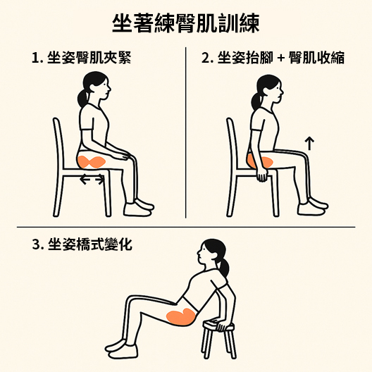 1. 坐姿臀肌夾緊:雙腳踩地,背部打直,用力夾緊臀部肌肉,維持3–5秒後放鬆。
