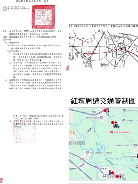 二、 管制範圍: (一)管制區域:烏瓦磘紅壇(雲林縣斗南鎮成功路38號),含周邊道路【範圍:北起雲林路三段、南至古坑路及五分溪導水路產業道路、東起雲81線、西至古坑路及溫厝角支線產業道路】。 (二)管制路段:斗南鎮成功路、瓦厝路、古坑路、中正路、石橋路、義德路、長安路、大成路、明昌路、建國二路、新崙中路、新崙西路、鄉道雲86、雲86-1、雲87、縣道158甲(東起古坑路口、西至土庫大橋),以上道路沿線路段,並視交通狀況機動調整管制時間及路段。