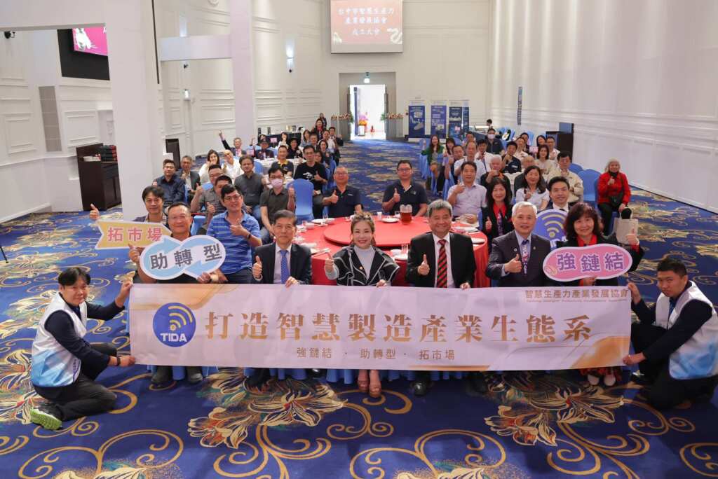 圖四: 與會來賓與會員熱情合照,共舉旗幟「打造智慧製造產業生態系」。活動現場除介紹協會理監事成員與工作團隊,亦展示會員企業陣容,涵蓋製造業上、中、下游及支援性軟硬體服務,展現協會在產業生態系中的廣泛影響力與高度凝聚力。