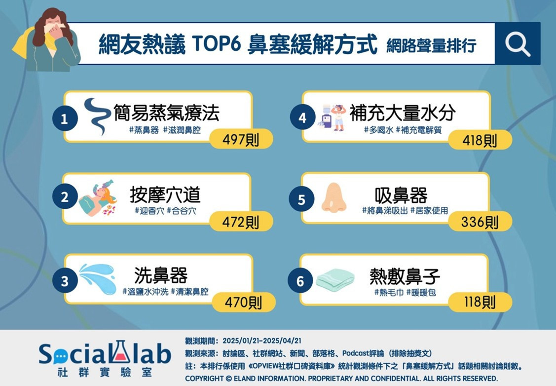 《Social Lab社群實驗室》本次透過《OpView社群口碑資料庫》追蹤近三個月內「鼻塞緩解方式」相關話題的網路聲量,帶您了解網友熱議的六大鼻塞緩解方式。