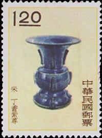 又如59年古物郵票的宋汝窯三犧尊、68年古代陶器郵票的商雙耳瓦尊和漢雙耳紅胎尊、70年代古代琺瑯器郵票的明 景泰三環尊及天雞尊、94年第18屆亞洲國際郵展紀念郵票的清代掐絲琺瑯天雞尊、102年古物郵票的明萬曆五彩百鹿尊與清 乾隆 粉彩百子圖燈籠尊、102年古代文物郵票小全張的清乾隆玉熊形尊等均是。