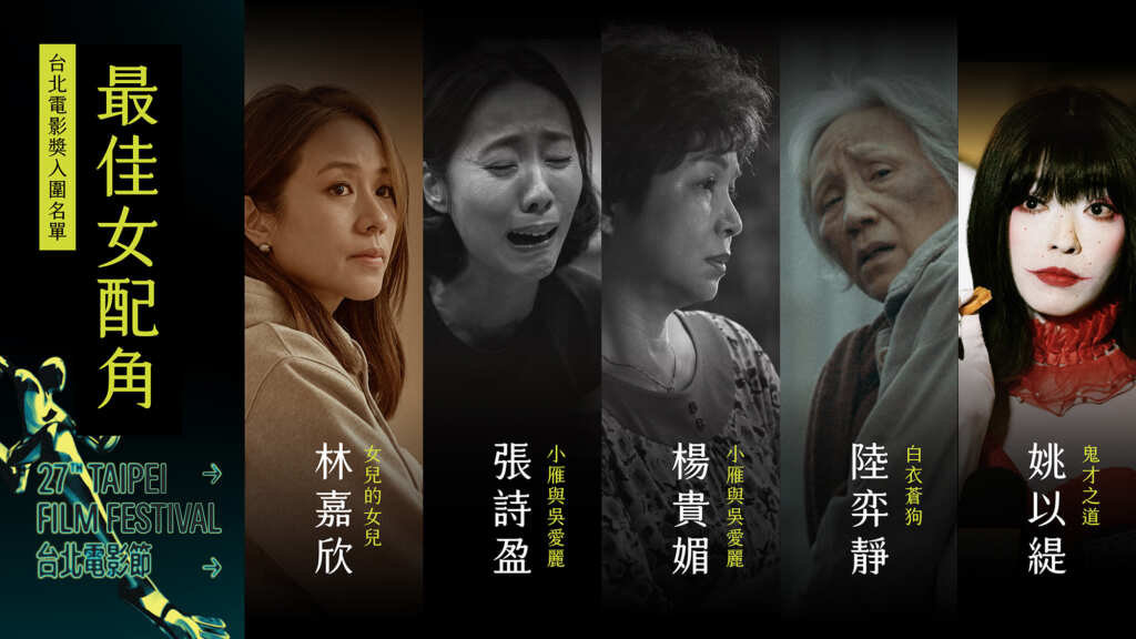 ▲2025台北電影獎入圍公布記者會字卡,最佳女配角名單(台北電影節提供)演員類獎項話題十足,新生代與資深演員同場競爭。男主角入圍者包括《白衣蒼狗》萬洛.隆甘迦、《我家的事》藍葦華、《河鰻》潘綱大、《鬼才之道》陳柏霖、《愛作歹》黃冠智;女主角方面則有《女兒的女兒》張艾嘉、《小雁與吳愛麗》夏于喬、《有病才會喜歡你》江齊、《我家的事》高伊玲與《鬼才之道》張榕容。