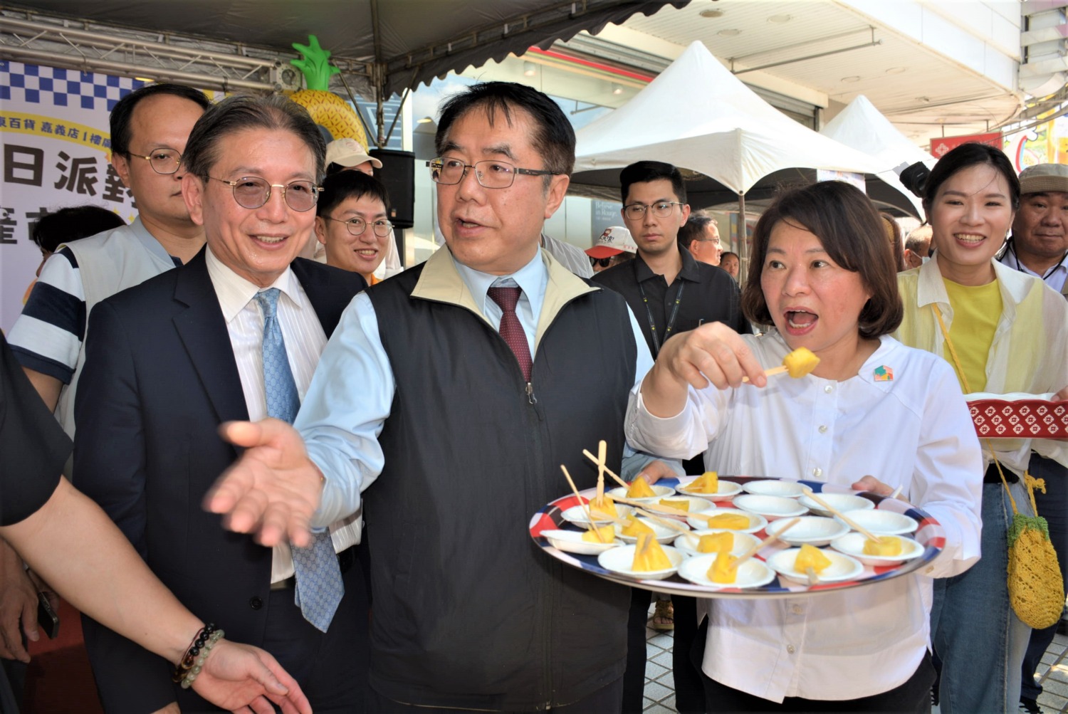 〔焦點時報/記者李芷妍、李芷妍嘉義市報導〕臺南市長黃偉哲為推廣臺南優質農特產品,5/17日專程來到嘉義市遠東百貨,參與熱鬧的「旺情夏日派對-臺南農產市集」,嘉義市長黃敏惠也以地主之誼,特別出席活動,向民眾推廣當季農產品,兩位市長相見歡,共同以香甜鳳梨製作消暑的鳳梨雪克調飲,及現切各項水果分送給民眾品嚐,在兩位市長號召下,現場買氣強強滾。