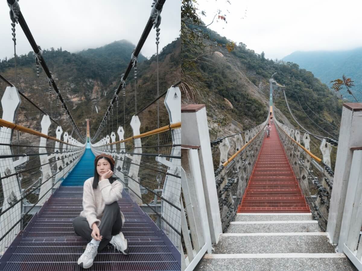 第二天早上建議直接往信義鄉挑戰全台最長彩虹橋!這座彩虹吊橋橫跨雙龍瀑布谷,全長342公尺、高度110公尺,站在中央真的會心跳加速。瀑布、山景、彩虹吊橋,怎麼拍都像明信片。