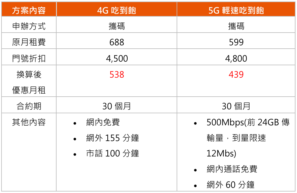 台灣大哥大近年積極佈建 5G 網路,並強化用戶體驗,在網路穩定性、客服品質都備受肯定,提供三大電信中最划算的資費價格。目前至洋蔥網通申辦攜碼台灣大哥大,4G 吃到飽資費方案原月租為 688 元,獨家加碼折扣 4,500 元,平均每月僅需 538 元,綁約 30 個月,是預算有限又追求穩定訊號族群的實惠選擇。