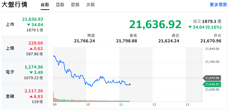 台股週五(23日)開盤一度逆勢開高上漲逾百點,最高逼近21800點,隨後因權值股腳軟,指數見高後遇壓,盤中翻黑下探21624、回測5日線,盤面資金湧入PCB、記憶體、觀光、金融等族群,預估成交量約3300億元。