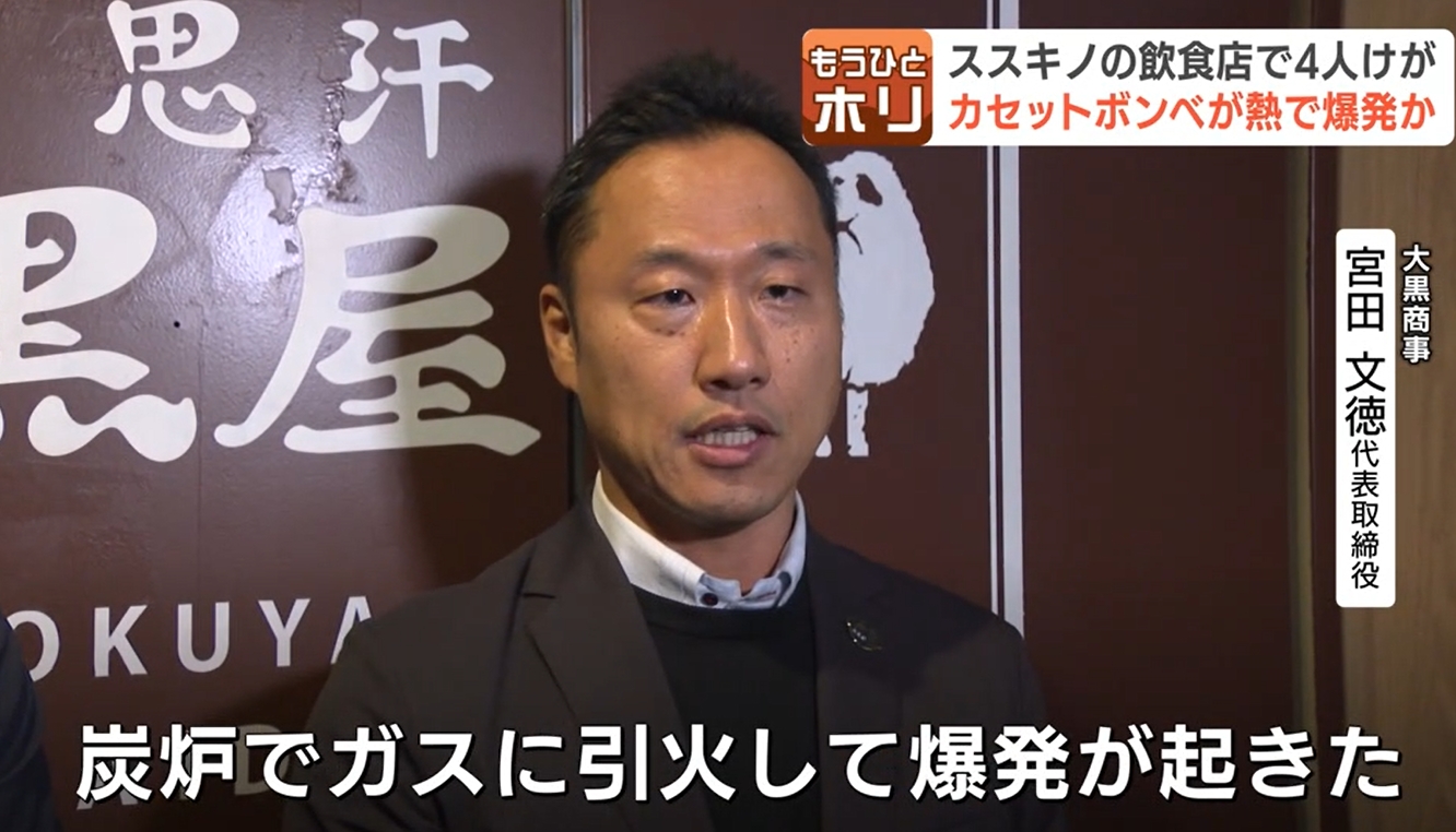 餐廳營運公司社長面對媒體時低頭致歉,坦言初步調查顯示爆炸原因為「生火用瓦斯罐破裂」,懷疑是在點燃炭火過程中,瓦斯罐因高溫膨脹而爆裂。他表示:「造成這麼大的困擾與不安,我們深感抱歉。」