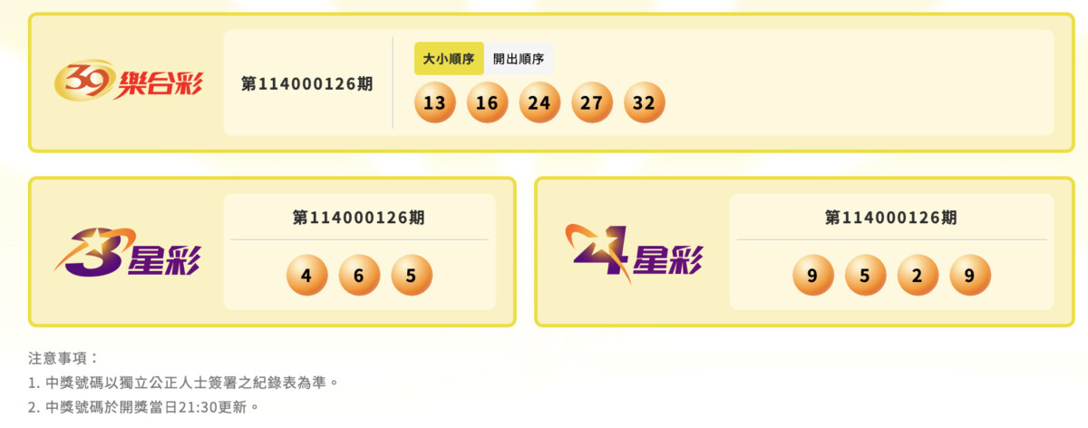 ▲台彩今開獎的39樂合彩、4星彩及3星彩的中獎獎號。
