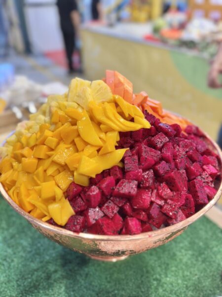 農業處表示,活動首(24)日推出三場快閃店活動接力引爆屏東芒果魅力!首先登場的是「屏東熱帶水果清涼一夏冰品料理秀」,特邀醒吾科技大學餐旅管理系專任講師梁語宸主廚,攜手屏東縣政府農業處陳美智副處長及新北市農會張麗梅總幹事,一同大展廚藝。現場除了綜合水果擺盤展示,還進行趣味PK挑戰製作大碗公綜合水果冰,讓屏東芒果的冰涼甜蜜香氣席捲全場。