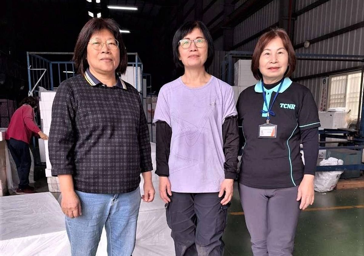▲員林就業中心大村臺外展人員(圖右)到場訪視,與涓姐(圖中)及禹泰工業資深入資(左)合影。(圖/中彰投分署提供)