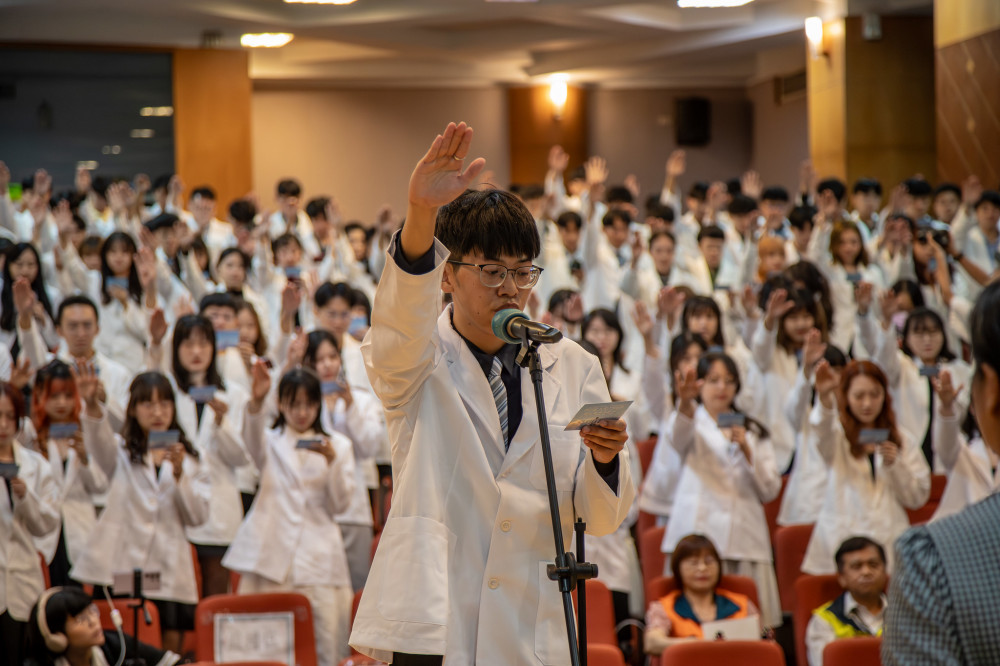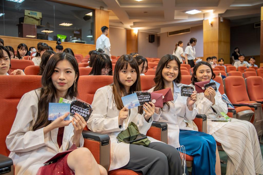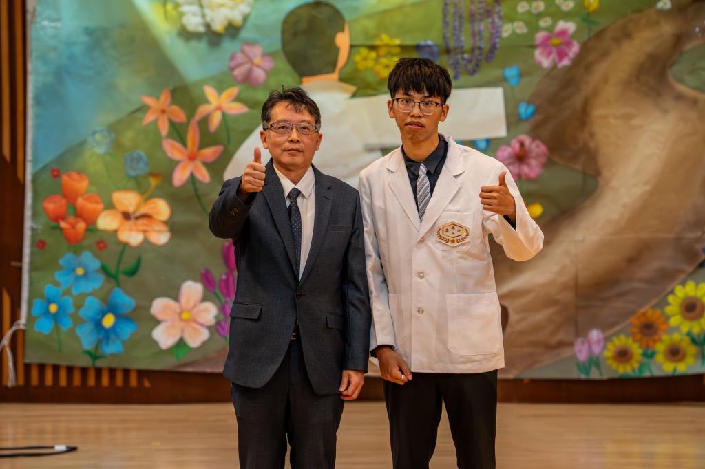 張翊峰校長致詞時勉勵學生,穿上白袍那一刻,意味著你們正式邁入專業起點,也是責任開始;他期許所有學生在師長與親友見證下,秉持「真實」校訓,虛心學習、恪守藥事法規,發揮藥師社會影響力,為國人健康貢獻專業所長。