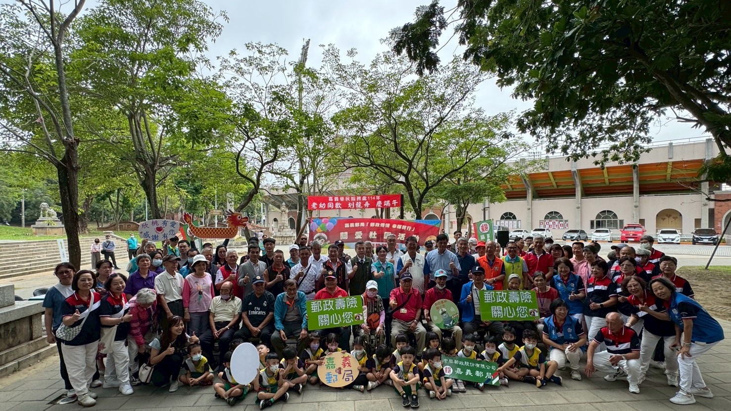 〔焦點時報/記者侯姵伃嘉義市報導〕嘉義榮服處與嘉義郵局於5/26日假嘉義公園共同舉辦,端午節前夕應景的「老幼同歡 划龍舟 慶端午」活動,活動一開始由東川鼓舞隊率先開場,由平均高齡78歲長輩率先擊鼓,鼓聲鏗鏘有力搭配舞蹈演出,振奮人心;隨後由嘉義市私立育志幼兒園小朋友登場表演才藝,在小朋友熱情活潑充滿朝氣的樂器及舞蹈表演下,現場充滿歡樂氣氛;同時也不免俗的安排與會人員參與陸上龍舟趣味健走,由2人合作將龍舟划向終點,象徵國人老幼童心、團結合作,以堅定愛國信念,共同守護國家安全。