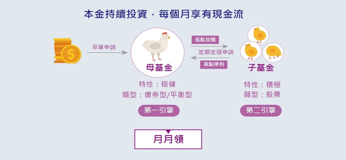 到這裡歸納出了幾個我想幫爸媽規劃退休金的重點,包含:一定比例的股票、以提高投資總報酬率為目標,但又要能兼顧長輩不愛太大波動的性格和每月兼領現金流的需求。要做到這些,我想不是單一檔股票或一檔基金能辦到,需要的是一套「投資方法」。我認為「母子基金」投資方式搭配月月領功能,就是退休規畫非常好用的工具。