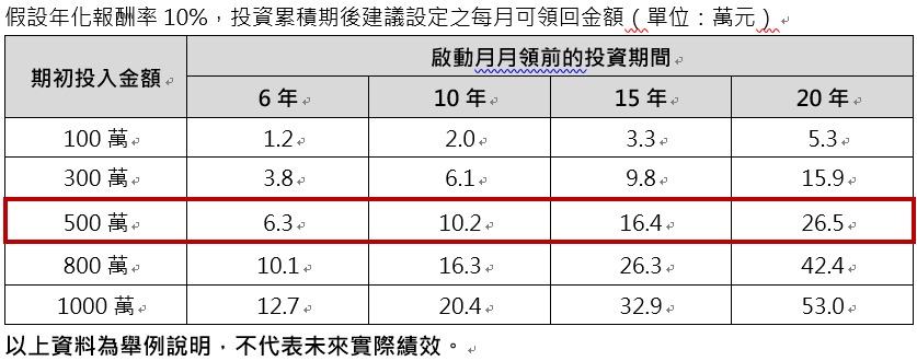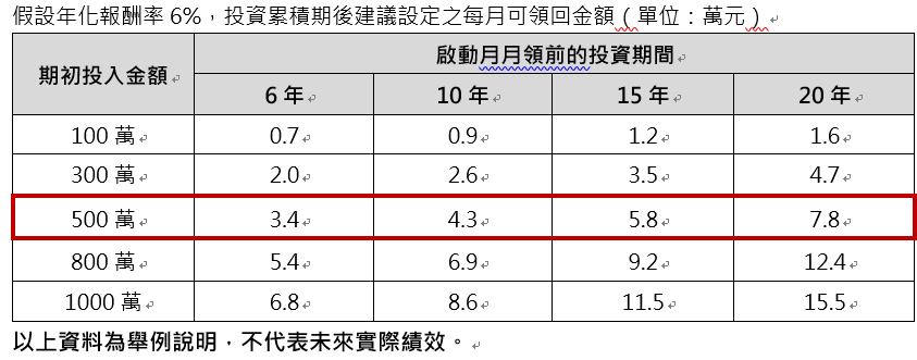 以我們家的狀況來舉例,假設長輩有一筆700萬的退休金,保留200萬當緊急預備金之後,剩下的500萬做三至五筆復華投信金複合母子基金投資合約,我會建議在還有其他現金流來源的情況下,先給投資一點時間累積,我以市面上最常見的6年儲蓄險期間來舉例,這筆合約我們前6年先不提領,第6年後開始提領。