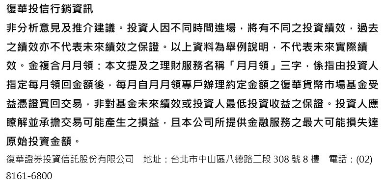 花點心思你會發現,近來基金公司、銀行、基金平台都陸續開辦母子基金投資方式,越來越多人加入,我認為也代表這套投資方法是經得起考驗的。而復華投信的「金複合投資法」,就是國內母子基金和月月領機制的創始者,已經有近25年歷史,系統、經驗都是最成熟的。而且復華投信有龐大資深的理財顧問群,不論是標的該怎麼選?或是系統操作問題,亦或市場雜訊滿天飛,我的投資到底有沒有問題?都能一通電話找到專業顧問協助,也能讓子女們放心,這些都是一般平台無法提供的。