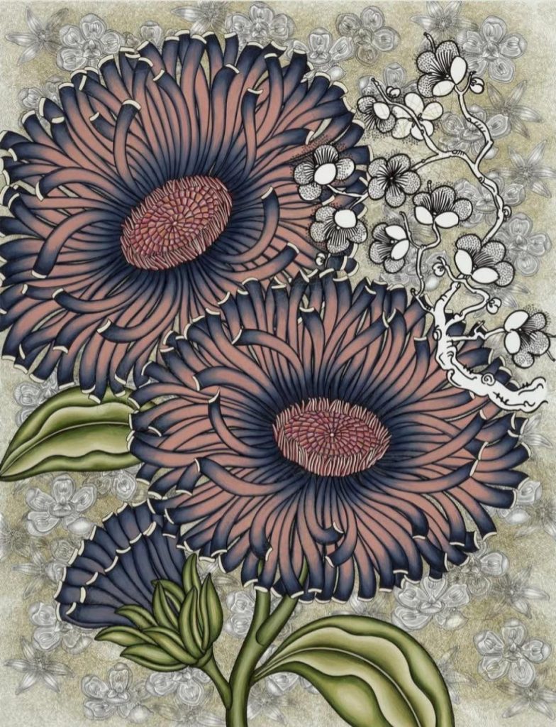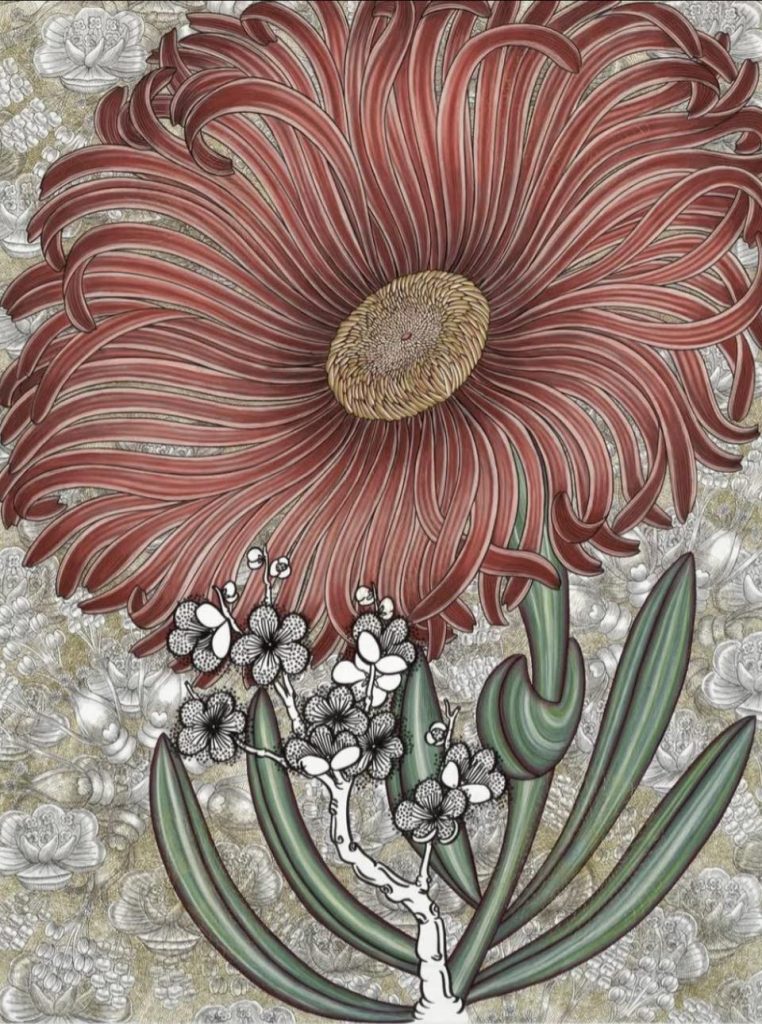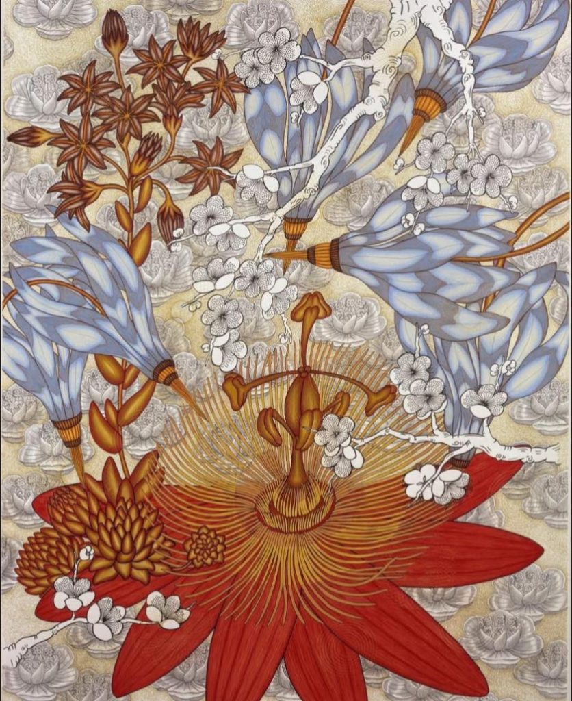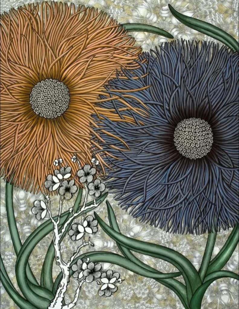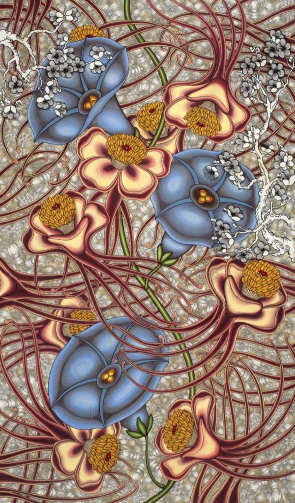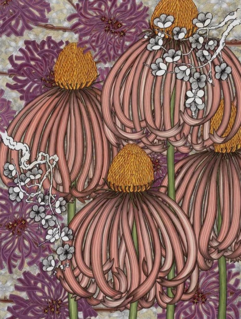 美國藝術家Nancy Blum 借用16、17世紀植物圖鑑的精緻細節繪法,以墨水、彩色鉛筆、水粉與石墨為筆,描繪不可能共存的花卉與植物:構築出一種既古典又未來的視覺神話。