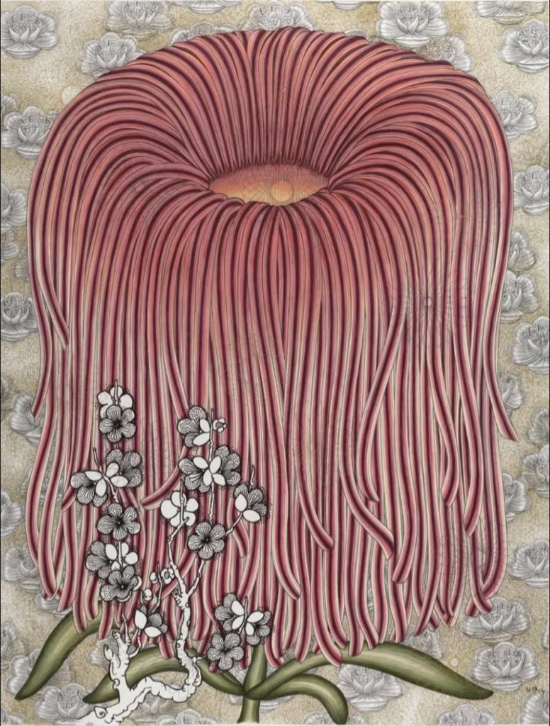 這些奇幻植物擁有毛髮般的花瓣、眼睛似的花蕊、盤根錯節卻優雅對稱的枝葉,看似華美卻又暗藏一種秩序與張力。旨在挑戰對於「生命週期」的浪漫想像,延伸出女性力量與自然秩序的象徵。