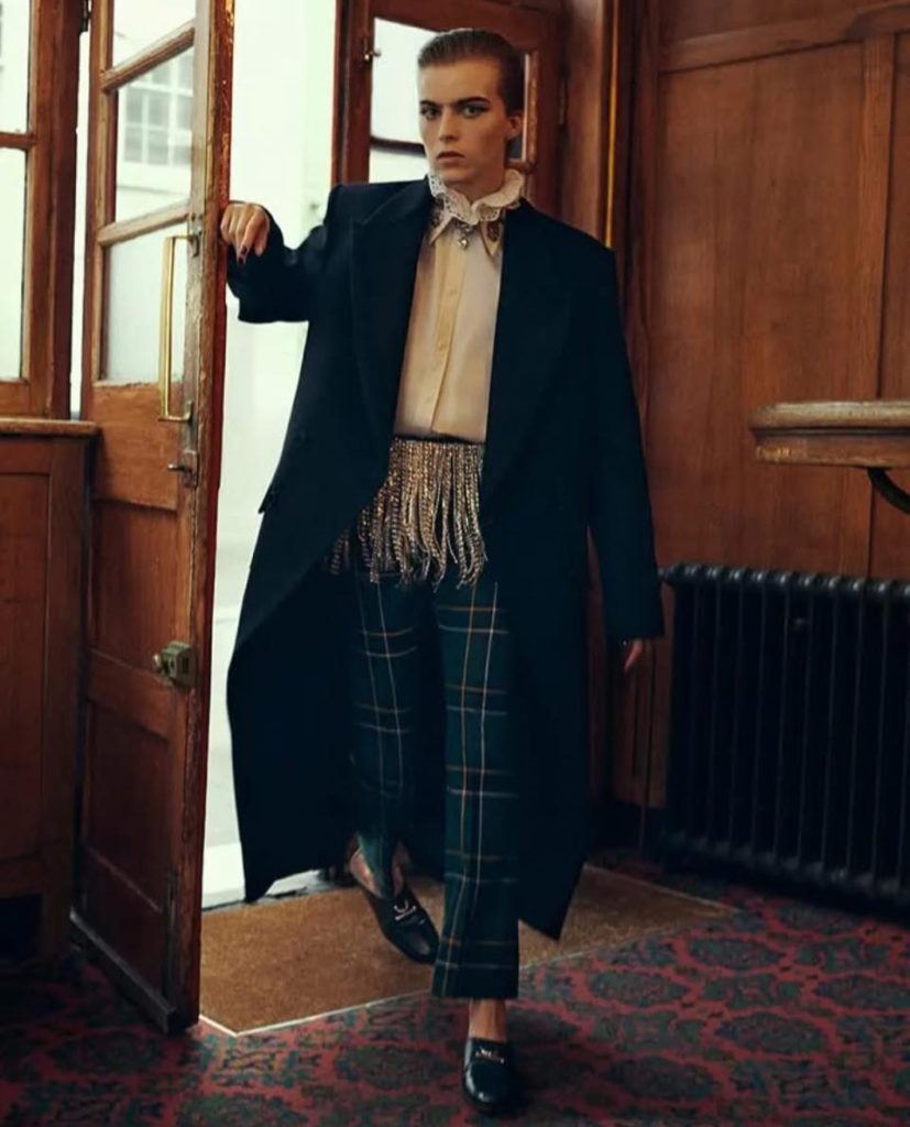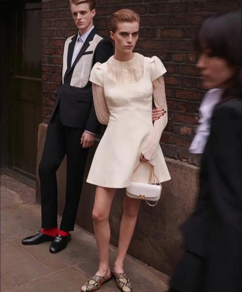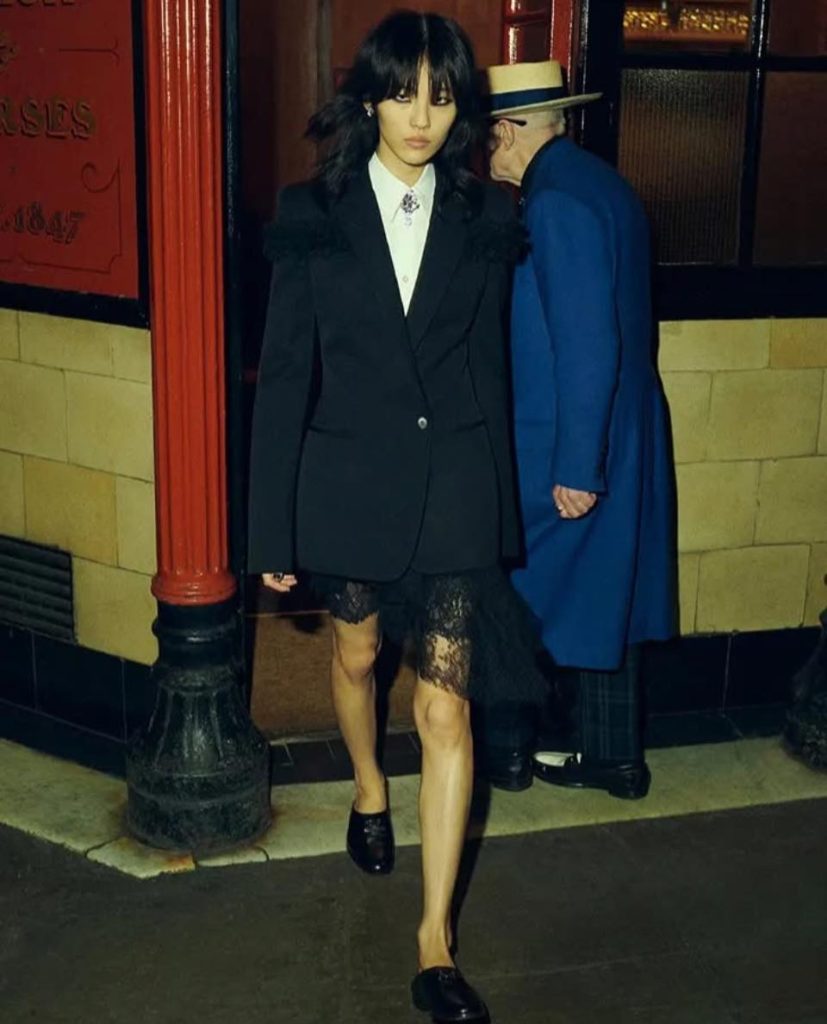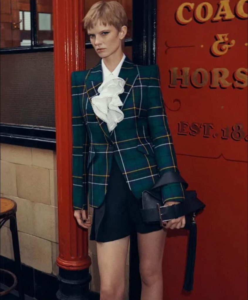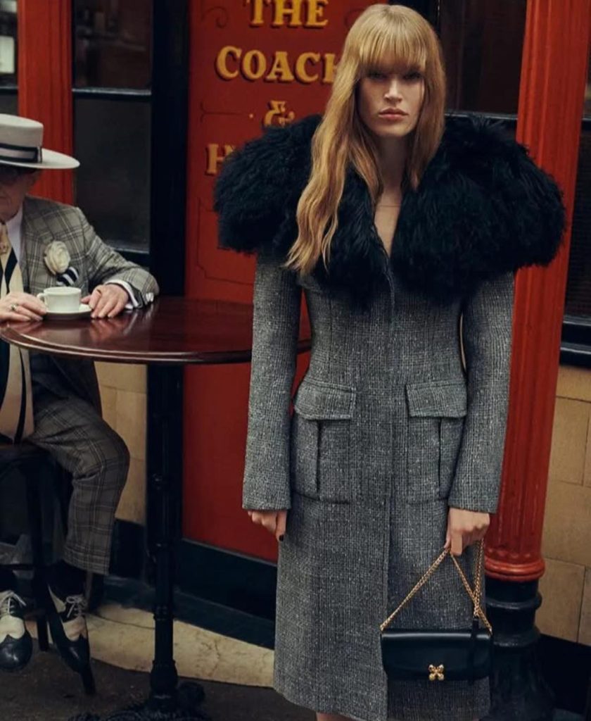 空氣裡潛伏著1950年代的時空;靴型設計與維多利亞式收腰剪裁,如同戰後「存在主義」在爵士酒吧的對話。攝影師刻意保留昏黃光影,模特兒身上的硫磺色調面料,與窗外倫敦霧霾產生——蘇荷區從戰後廢墟轉為波希米亞聖地的一場色彩化學顯影反應。