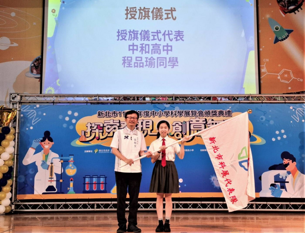 圖說:新北市科展頒獎典禮由教育局長張明文與中和高中程品瑜同學代表授旗。
