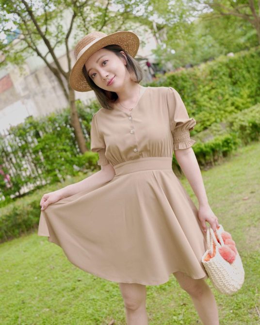 玉兔穿著杏色短洋裝,戴著藤鞭草帽,皮膚白皙、四肢纖細的她,整個人散發青春少女的氣息,看不出已經是一位準媽媽,照片中玉兔捧著肚子,看得出肚子明顯隆起,小腿也沒有出現水腫的情況,另一張她拉著裙擺,甚至看不太出來她的孕肚。