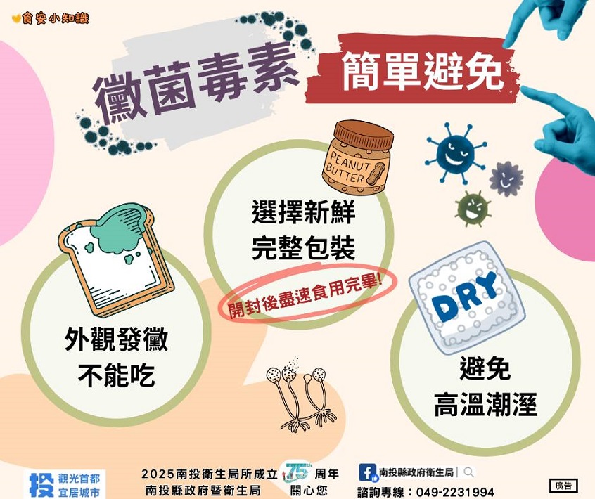 另,衛生局指出,花生、米類及穀類產品若處於高溫潮濕環境,特別容易滋生黴菌,進而產生毒素,因此無論是製造、運輸、販售或家庭儲存階段,都應嚴格控管溫度與濕度,呼籲業者應善盡食品安全管理責任,確實做好原物料、半成品及成品之保存,並落實先進先出原則,避免商品過期或變質;消費者在選購時,也應認明信譽良好的廠商、注意製造日期與包裝完整性,發現食品變質或發黴應立即丟棄。