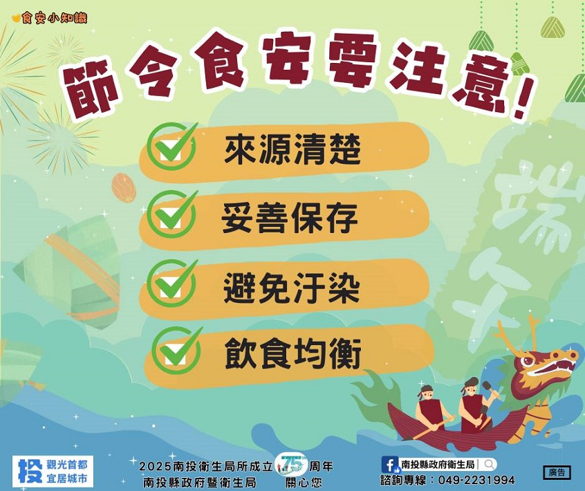 衛生局指出,端午節是許多家庭重視的傳統節日,賽龍舟、吃粽子是每年這時候不可或缺的習俗。其中粽子更是代表性的美食,常見的餡料有糯米、滷肉、鹹蛋黃、香菇等,包裹在清香的竹葉中,不論甜的鹹的都讓人食指大動。