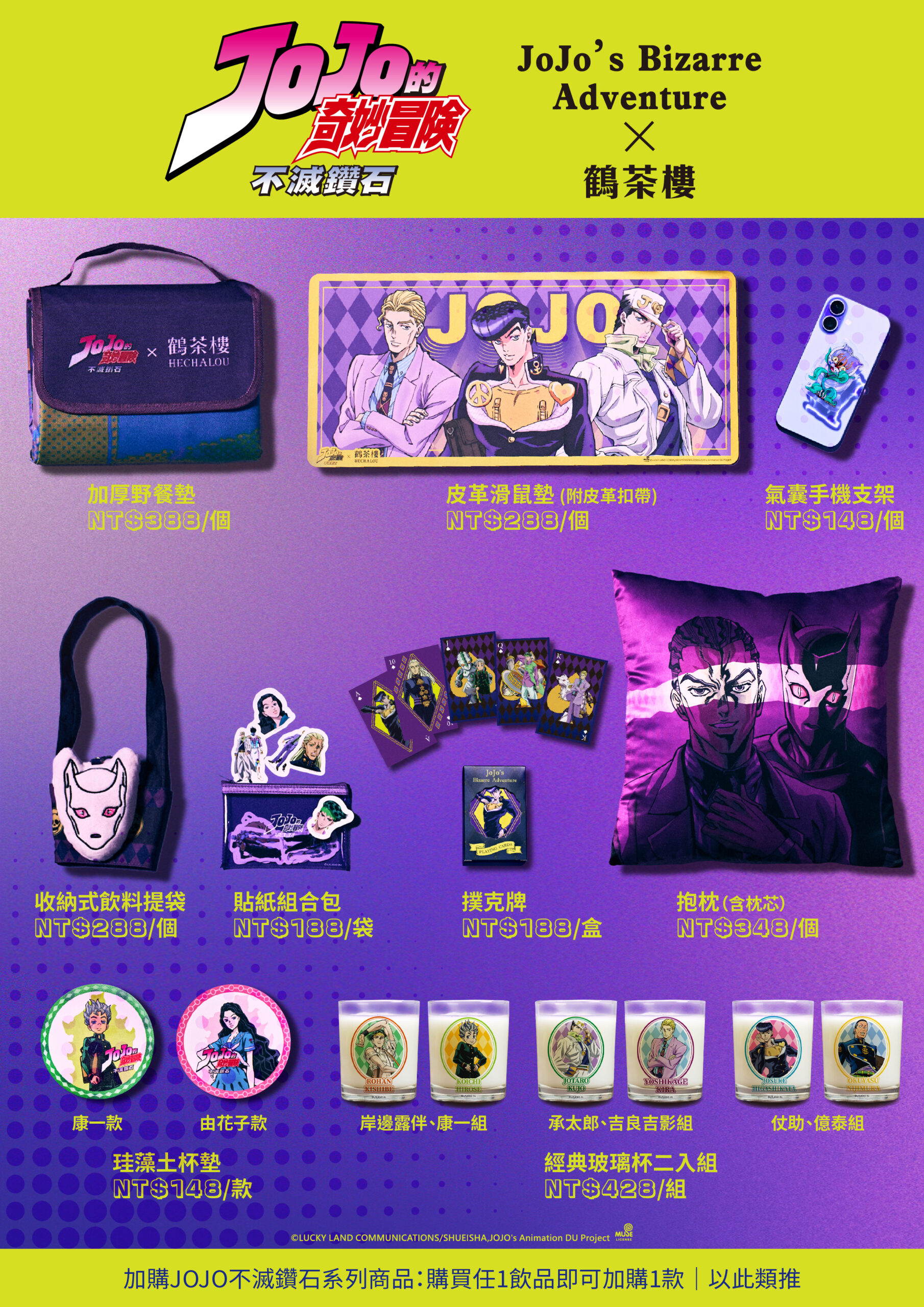 鶴茶樓x《JOJO的不滅鑽石》聯名活動將自6月4日開始,全系列商品皆為限量販售,預期將掀起粉絲間的搶購熱潮,無論是手搖控還是JOJO迷,這場聯名企劃,已成為今年夏天最值得期待的話題。