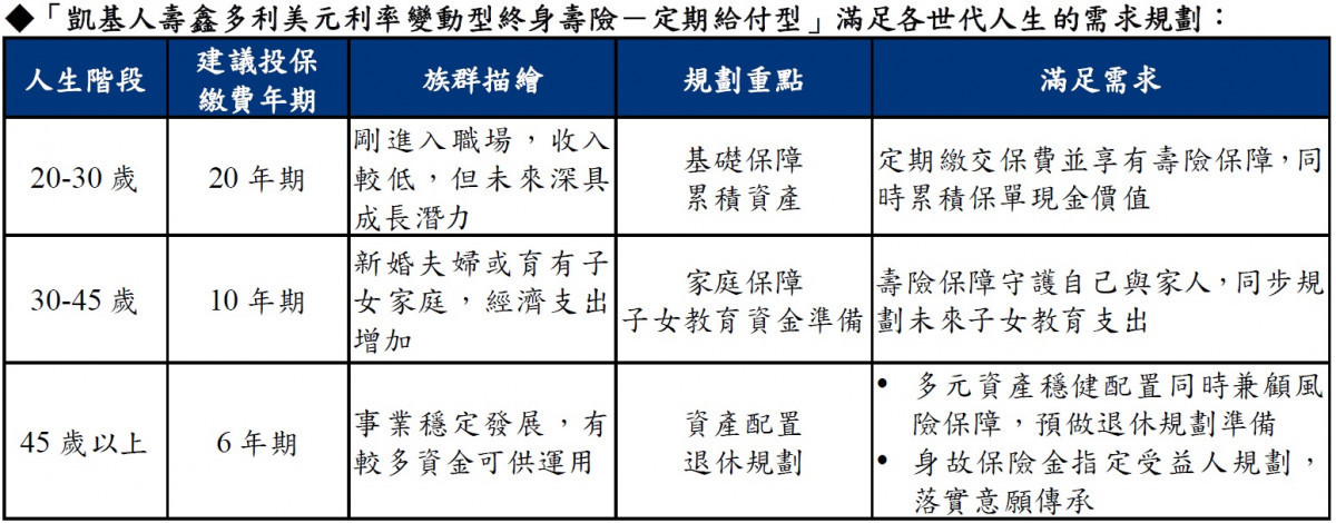 「凱基人壽鑫多利美元利率變動型終身壽險-定期給付型」滿足各世代人生需求規劃。