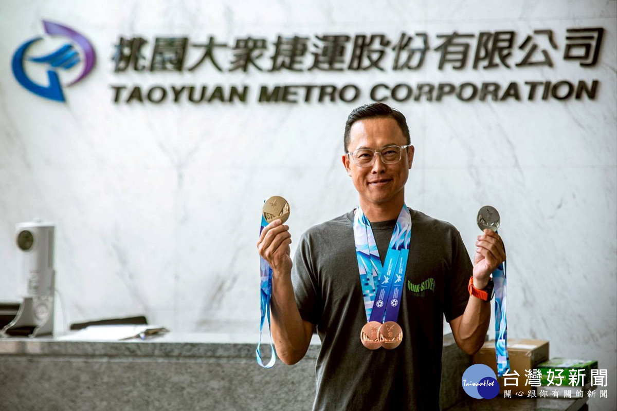 2025年世界壯年運動會盛大登場,桃捷公司企劃處同仁張俊傑參加立式划槳(SUP)4項比賽表現亮眼,拿下1金1銀2銅佳績,其中在50歲以上男子12公里馬拉松的競賽中,以2小時07分13秒奪得金牌,真正做到「運動無界、人生無限」。除了為自己的人生寫下亮麗的篇章,更為桃捷增添光彩。
