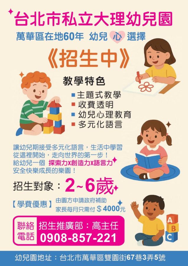 大理幼兒園園長蔡麗華受訪表示:「我們深信,幼兒教育的根本是尊重孩子的獨特性與發展節奏。」她指出,園所創立已逾六十年,一直以來秉持「以愛陪伴成長」的教育初心,重視每位孩子的探索力、表達力與情緒發展。