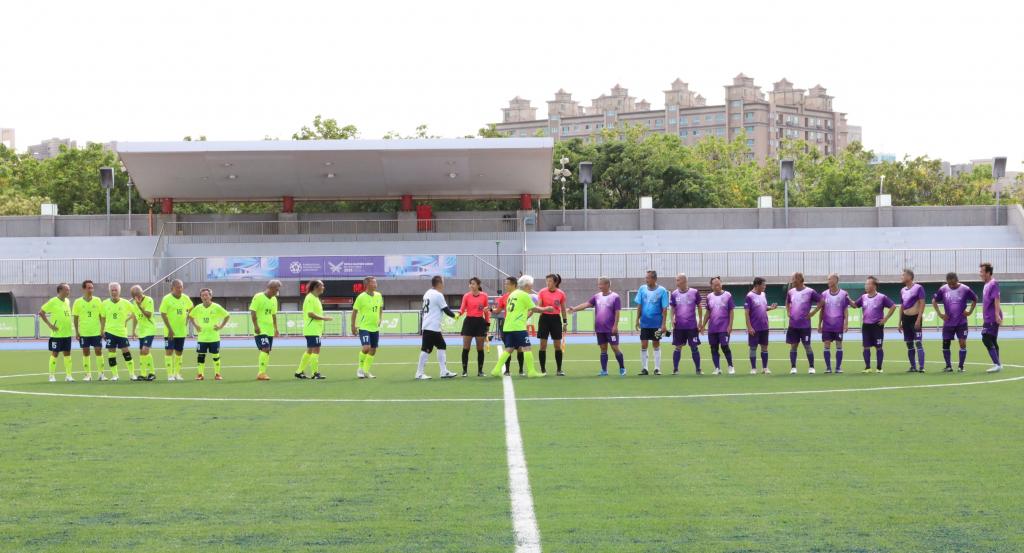2025雙北世界壯年運動會足球賽事5月25日至5月30日在新竹縣第二運動場舉辦,吸引國內外8組隊伍,總計約200位壯年選手參賽,5/27日賽事第三天,由65歲以上男子組台灣隊「Taiwan team」對戰同樣是台灣隊「Ever Young FC」,雙方勢均力敵,戰況膠著,最終以2比2打平。5月29、5月30日上午將迎來足球冠亞軍賽,新竹縣政府誠摯邀請民眾入場觀賽,一起為選手們喝采!