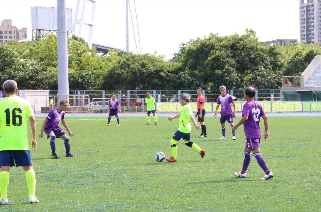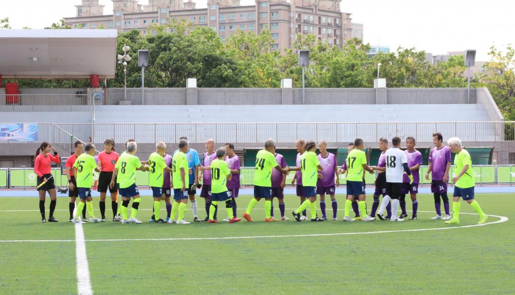 ▲世壯運足球項目65歲以上男子組,5月27日下午由台灣隊「Taiwan team」(黃衣)對戰同樣是台灣隊「Ever Young FC」(紫衣),雙方勢均力敵,戰況膠著。(圖/竹縣府提供)