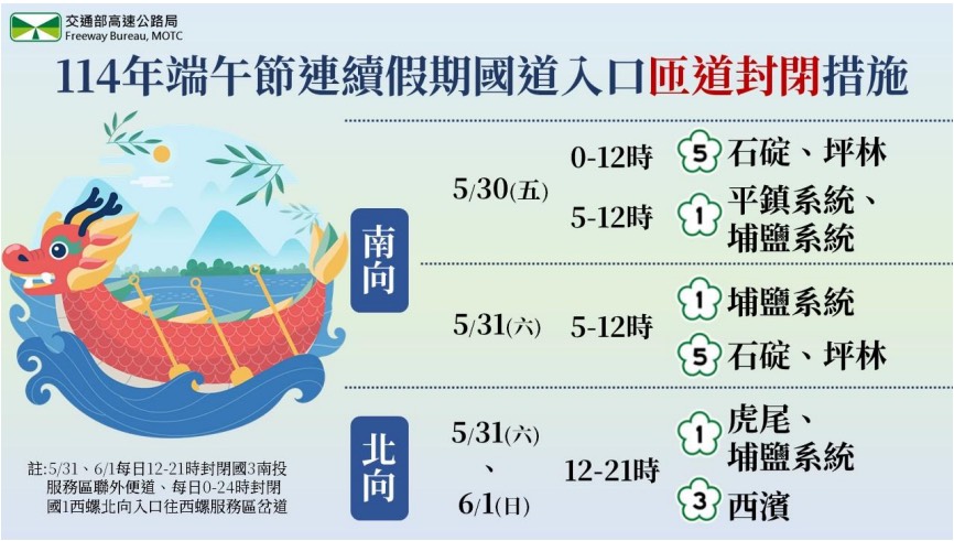 今(114)年端午節連續假期自5月30日(星期五)至6月1日(星期日),共3天,本次新竹轄內國道1號(竹北、湖口)及國道3號(寶山、竹林及關西)各交流道未實施匝道高乘載管制。(各項高速公路管制措施詳情請洽高速公路局官網https://www.freeway.gov.tw/Publish.aspx?cnid=193&p=40045)