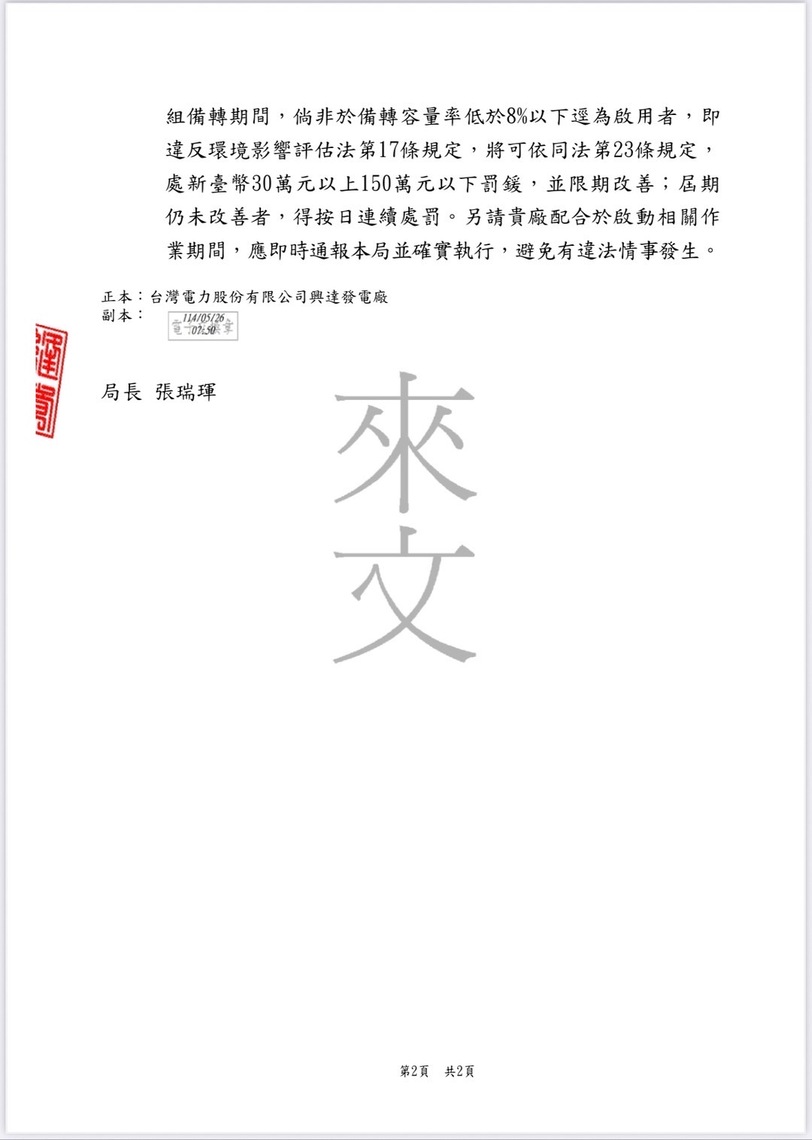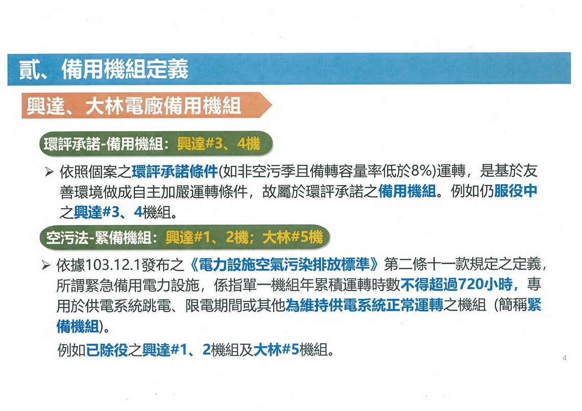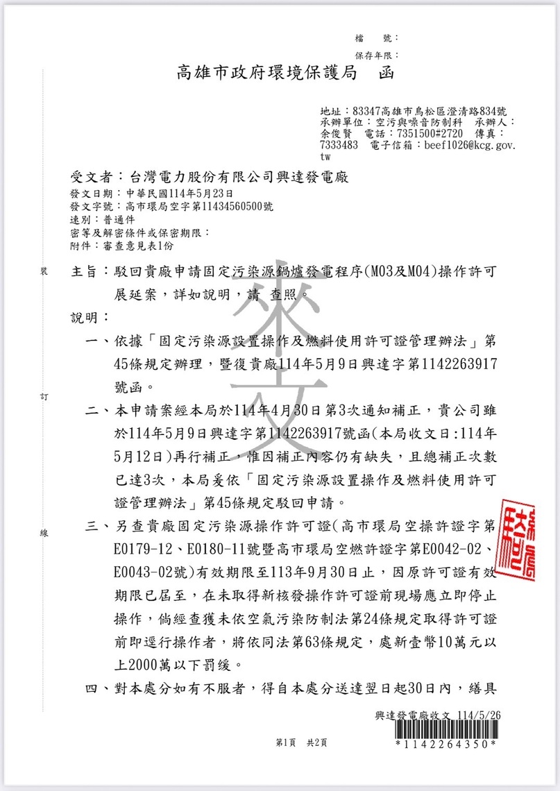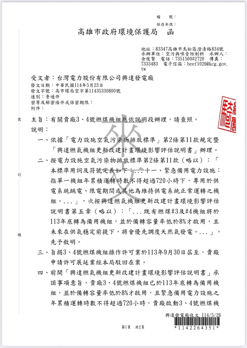 對此,高雄市政府環境保護局長張瑞琿回應表示,興達3、4號屬備援機組,依空汙法公告可列為緊急備用設施,在國家電力備轉不足情況下啟用並不違法,且已向台電重申總運轉時數上限不得超過720小時,市府將依法監督,違規必罰,並未有包庇情事。
