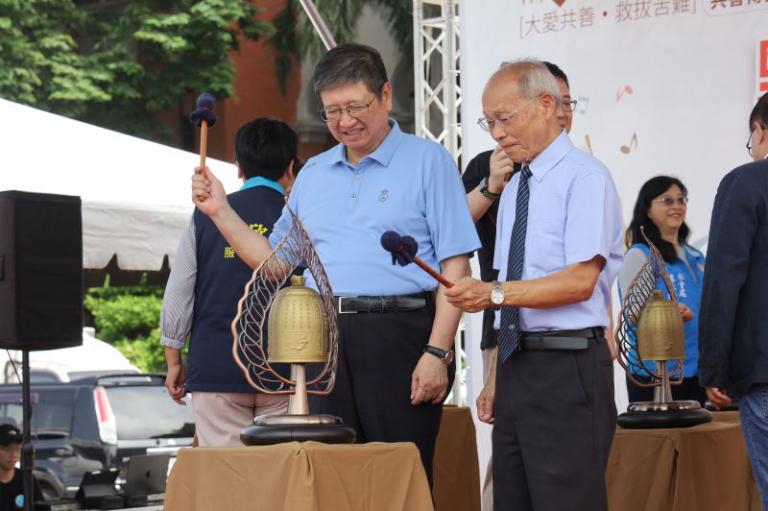 ▲縣長楊文科於「點亮微光,讓愛飛揚」愛心義賣園遊會敲響愛心鑼。(圖/記者蔣彤雲攝)