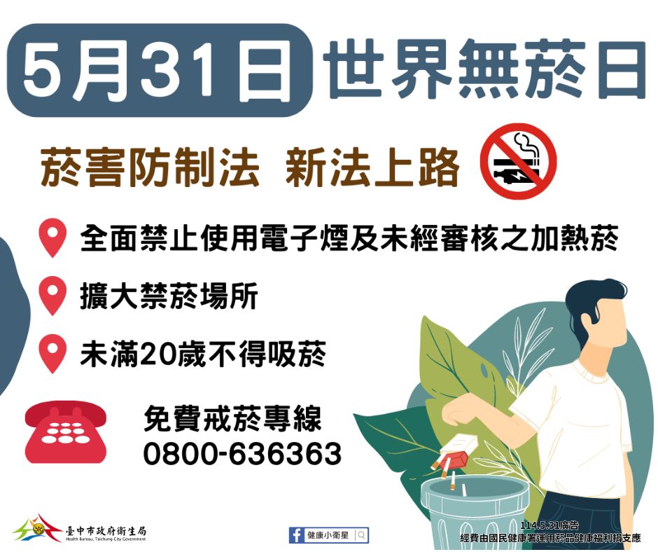 台中市衛生局表示,為響應世界無菸日,台中市衛生局於社區、職場、學校推出一系列反菸宣導活動。今年特別聚焦「揭露行銷手法、戳破菸害誘惑」,強調即使標榜「低害」的新型菸品,依然含有尼古丁與其他有害物質,對人體健康造成長期影響。