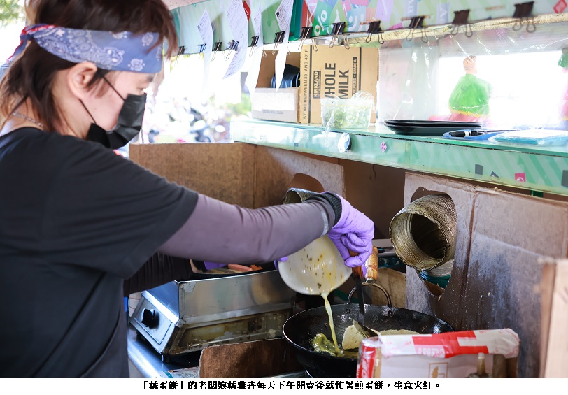她賣的蛋餅,不像一般早餐店在賣的「薄薄的一片」,而是用麵粉揉成厚厚的餅皮,透過油炸而成外酥內軟,分成五種口味,包括蔥花口味、蒜香口味、九層塔口味、香辣口味及沙茶口味,隨客人選擇。她說,這樣的蛋餅比一般的多元化,可以滿足各種口味的消費群。