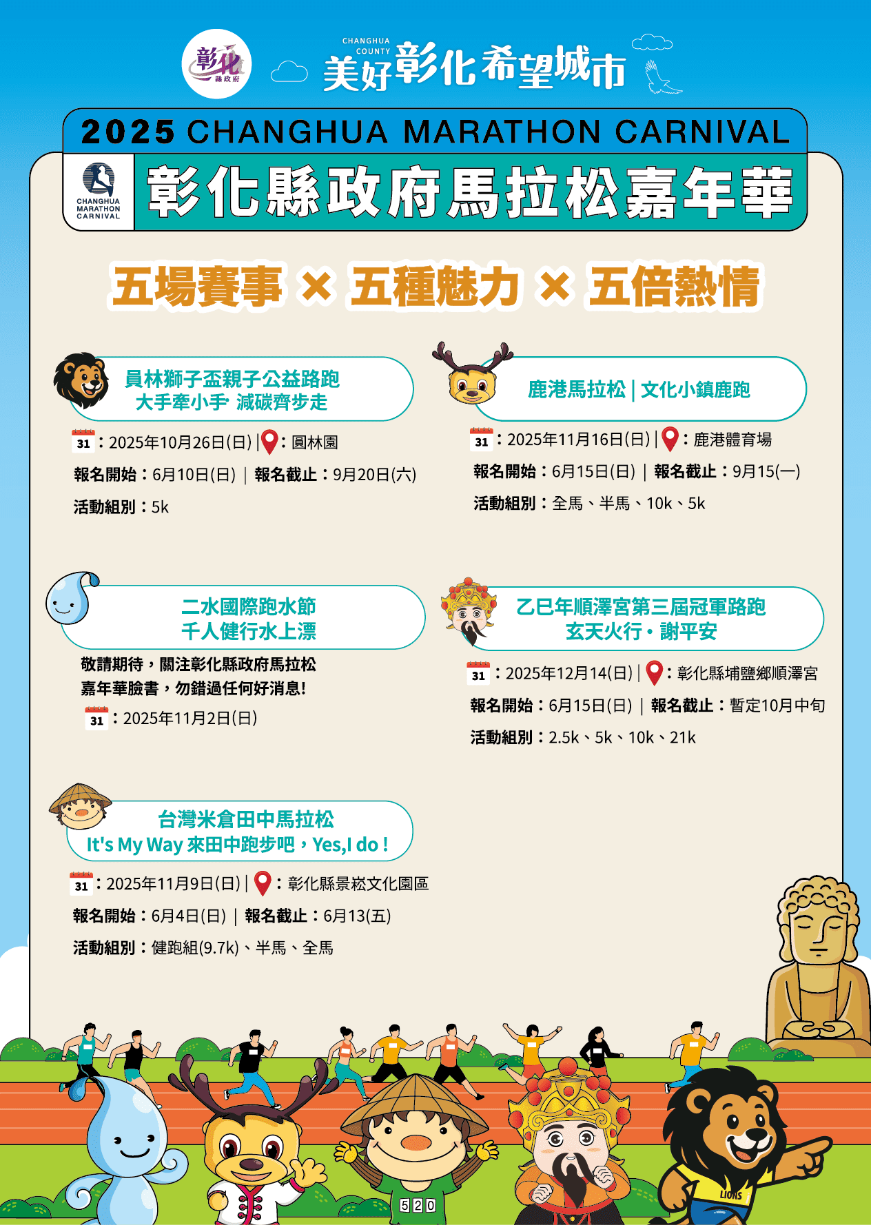 王惠美表示,今年五場賽事分別為:10月26日「員林獅子盃親子公益路跑」融合公益與親情,號召全家大小一起為愛奔跑;11月2日「二水國際跑水節—千人健行水上漂」展現二水水文化魅力與生態風貌;11月9日「台灣米倉田中馬拉松」跑進稻浪之間,體驗農村的純樸與熱情;11月16日「鹿港馬拉松」穿梭古蹟街區,感受鹿港的歷史與文化底蘊;12月14日「順澤宮冠軍路跑—玄天火行‧謝平安」結合信仰文化與年終祈福,讓跑者在奔馳中感受宗教祝福與地方力量。